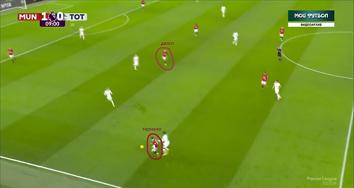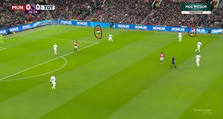 Если честно, то тяжело мне догадаться, в чем именно была идея Тен Хага в этом построении, единственное мое объяснение - это большинство в центре поля, у хозяев аж 4 игрока было в этой зоне против 3-х игроков ТТХ. Но парадокс в том, что МЮ и не играло через центр, а постоянно была ситуация, когда либо Онана, либо Эванс подсовывали мяч Гарначо, у которого на спине постоянно висел Удогие, и что дальше аргентинцу делать с этим мячом? Непонятно. Кстати не в упрек, а просто, как факт, что именно после такой «комбинации» МЮ заработал угловой у своих ворот, с которого Ришарлисон воткнул головой. Кстати очень хочется отметить угловые от ТТХ, а именно подающего Порро, ну очень классные подачи, тяжелые и под выход вратарю и удобные, чтобы бить или срезать. До этого Далот вынес с пустых тоже после углового Тоттенхэма.