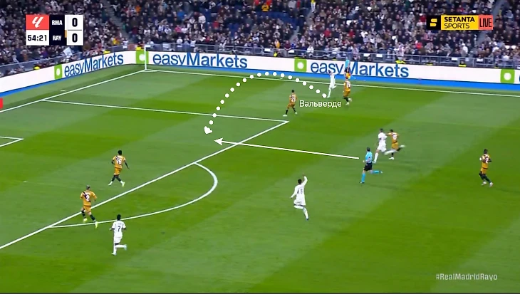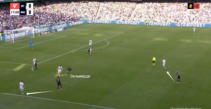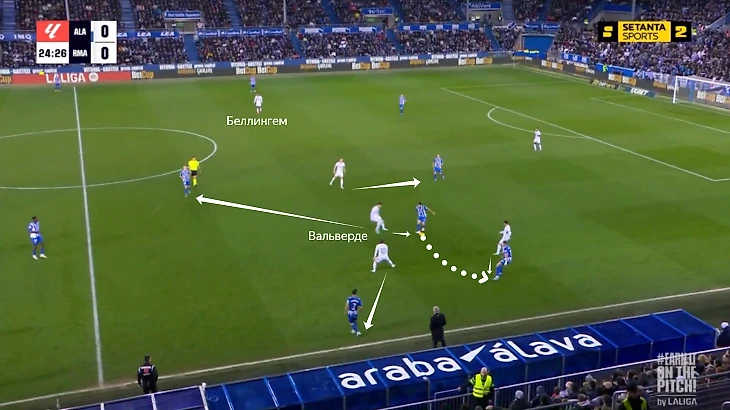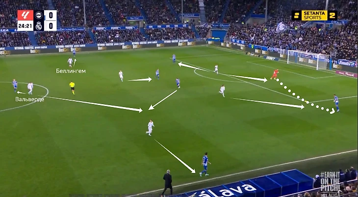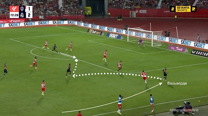 Гол Винисиуса «Альмерии» стал возможен только благодаря рывку Вальверде. Он оторвался от Гонсало Мелеро и увидел открывание Беллингема между линий.