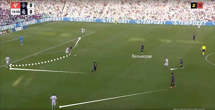 В игре с «Бетисом» Феде опекал опорника Марка Року. Иногда ему приходилось высоко выдвигаться за ним. Вот испанец открылся между центральными защитниками – на него отвлекся Лука Модрич, а уругваец остался ниже для сохранения компактности.