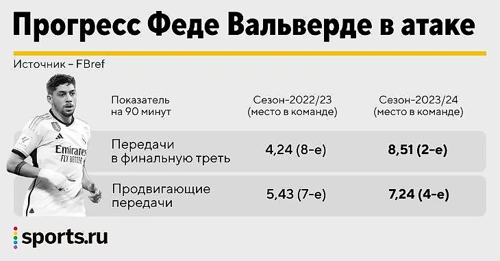 Уругваец помогает Карло Анчелотти строить мощный и гибкий «Реал». Он выходит на разных позициях, выполняет сразу несколько задач и поражает объемом (успевает практически везде). Даже невероятный прогресс Джуда Беллингема не обошелся без влияния Вальверде.
