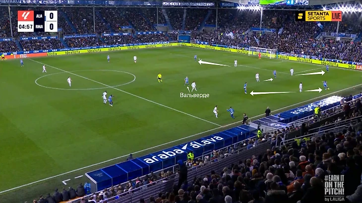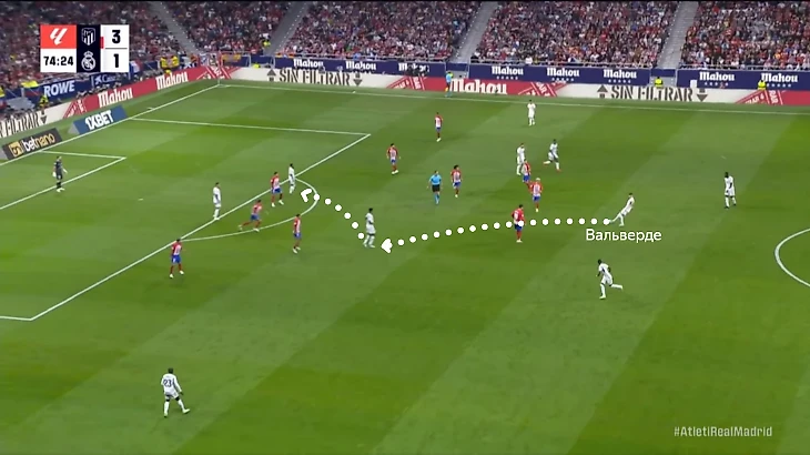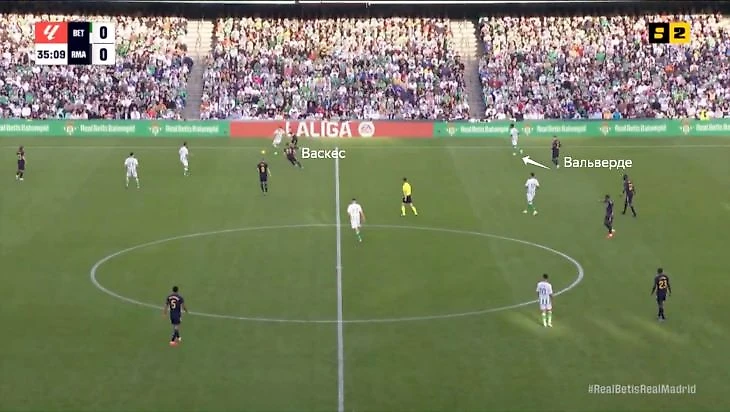Вот так он подстраховал Лукаса Васкеса при его выдвижении за Абде Эззальзули. Вальверде вовремя сместился правее за Абнером и перекрыл развитие атаки через эту зону.