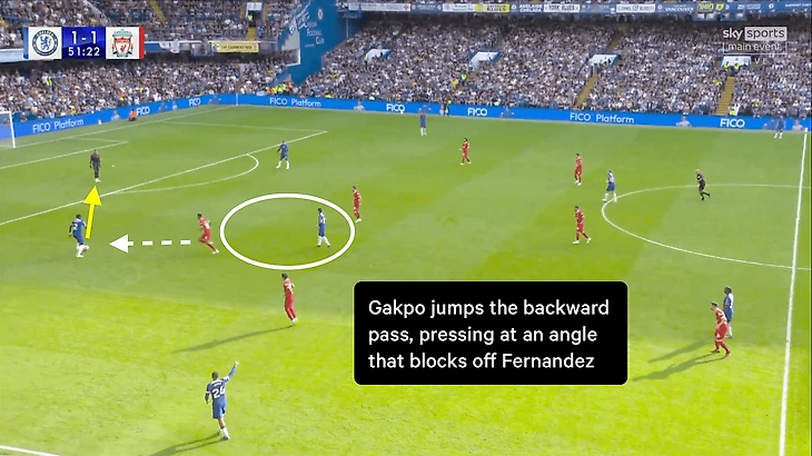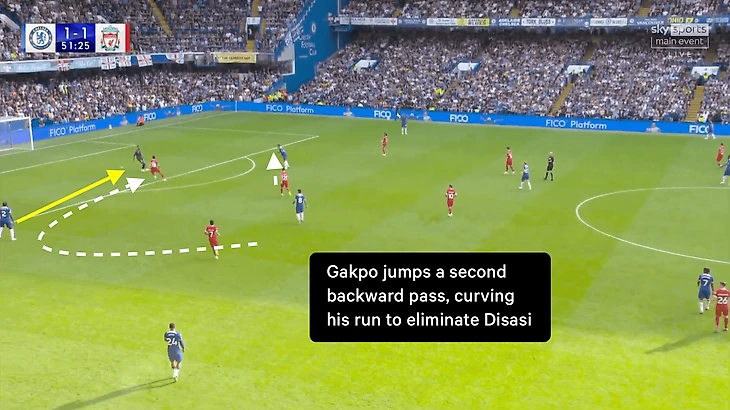 Забег дугой в прессинге от Гакпо отсек двух игроков «Челси» в билд-ап и закрыл вратаря, что привело к опасному моменту «Ливерпуля» секундами позже.