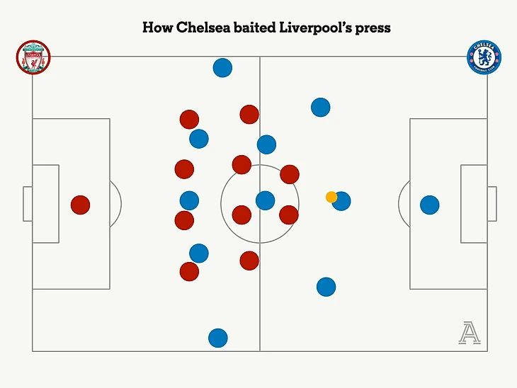 Но «плохие» отыгрыши Фернандеса в стенку не были случайностью. Любой умный опорный полузащитник знает, что получая мяч с закрытым корпусом в той зоне, все равно, что размахивать красной накидкой перед защитой «Ливерпуля», и Фернандес видел, что Гакпо был готов играть на опережении, чтобы накрывать центрального защитника после отыгрыша. Таким образом, «Челси» придумал, как выманить прессинг «Ливерпуля», чтобы потом доставить мяч Джеймсу: