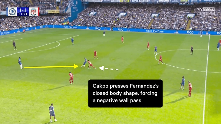 Фернандес начал игру высоко между линиями и лишь эпизодически опускался перед Гакпо, чтобы развернуться и выполнить диагональ Рису Джеймсу на фланг. Когда «Ливерпуль» понял, что это будет проблемой, Гакпо стал следовать за Фернандесом, когда тот падал между линий, чтобы не дать ему развернутся с мячом. Вот как он смог добиться успеха в прессинге, который мы увидели ранее.