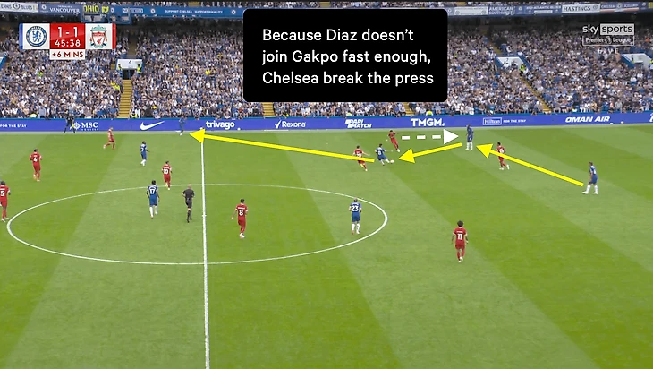 Причина, по которой это проходило раз за разом, заключалась в том, что Луис Диас не успевал считать игру на опережении Гакпо, атакующего отыгрыш в стенку, и выдвигающегося вперед, чтобы помочь перекрыть другие выходы из-под прессинга. И его задержка в доли секунды имела решающее значение между выигрышным высоким прессингом и неудачным: