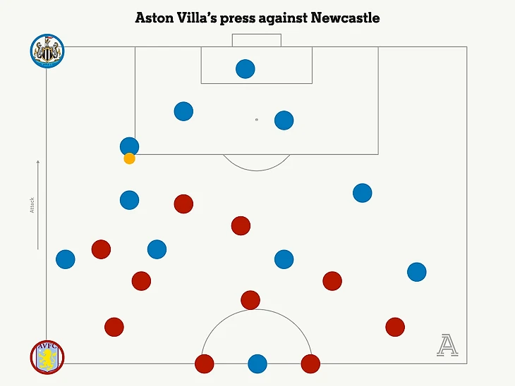 Несколькими часами ранее «Астон Вилла» в первом тайме поймала новичка «Ньюкасл Юнайтед» Сандро Тонали в похожей ситуации, вызвав каскадный водопад давления. Это была хорошая иллюстрация того, почему триггеры имеют значение, поскольку у Виллы был не один игрок, гоняющийся за мячом, а целая серия прессингующих, распознающих сигналы и грациозно прорываясь вперед с каждой передачей.