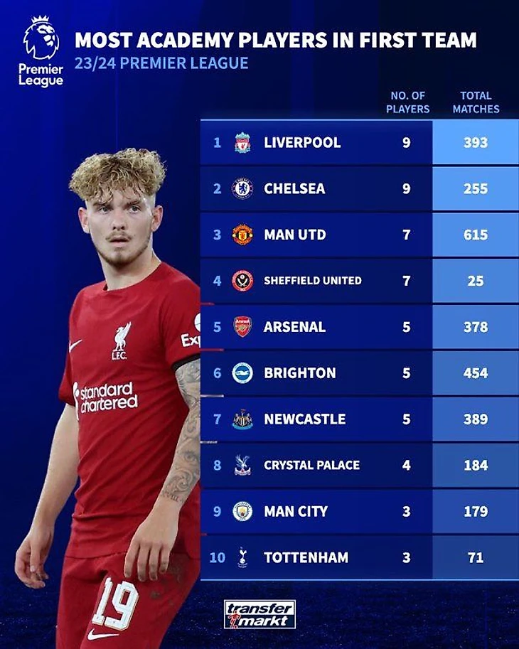 TransferMarkt подсчитал количество воспитанников собственных академий в командах АПЛ – по количеству игроков в составах лидируют «Ливерпуль» и «Челси» – по 9.