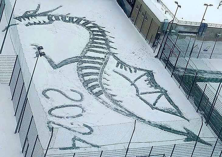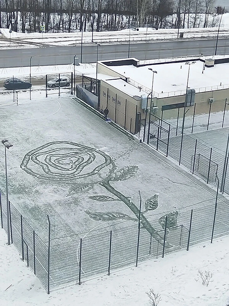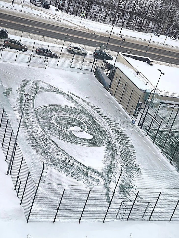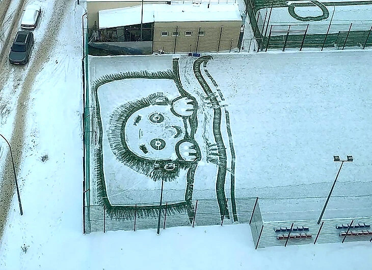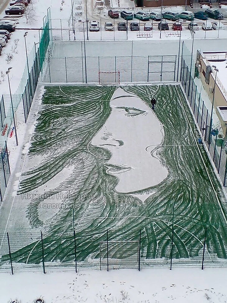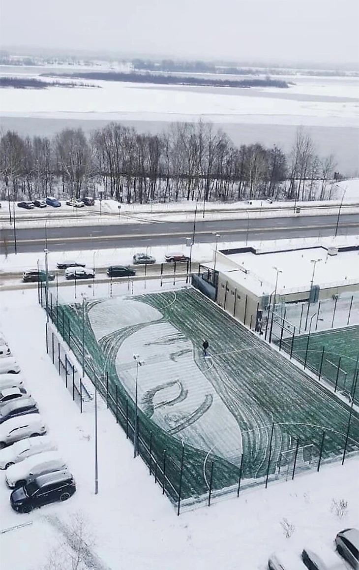 Как-то раз я очистил половину поля, и пришла мысль попробовать. Торопиться-то некуда, игра только в шесть вечера – эти поля арендуют и для любительских матчей, и для детских тренировок. Нарисовал половину лица: глаз, профиль, кончик носа, губы. Удобно – не будет ошибок с симметрией. Что-то нарисовал, позвонил напарнику, попросил посмотреть сверху. Но для него картинка была перевернутая, поэтому он ничего не понял. Сказал: «Чего дурака валяешь?» Я ответил: «Открой тогда, я сам схожу посмотрю». Поднялся на 17-й этаж, посмотрел. Потом спустился, овал лица еще немного поправил. Готово. Сделал перерыв, попил чаю и счистил весь снег до конца.