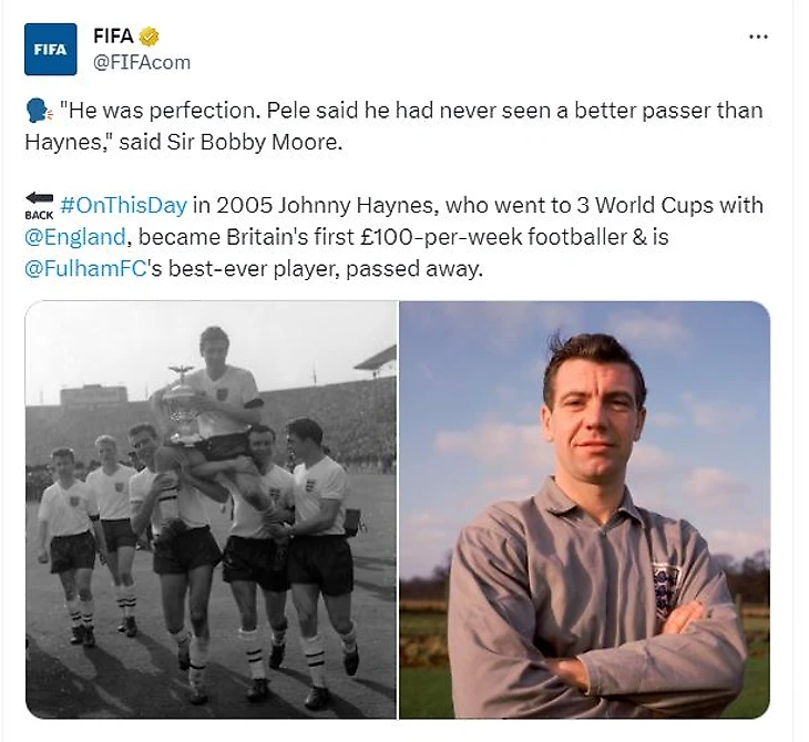 Хейнс сыграл 56 матчей за сборную Англии, в том числе 22 в ранге капитана, и сам Пеле как-то сказал про него: «это лучший распасовщик, которого я видел». Скорее всего, Джонни поучаствовал бы на победном ЧМ-1966, но в 1962 он получил серьезные травмы в автокатастрофе, и, как говорят, не смог вернуться на прежний уровень - во всяком случае, в сборную он больше не вызывался. Ему поставлен памятник у стадиона, и его именем названа главная трибуна.