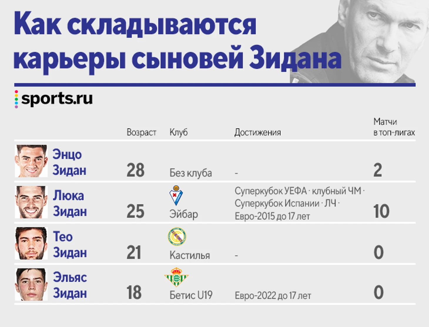 В 2017-м старшего сына Зидана подхватил «Алавес». Там Энцо не блеснул – провел всего два матча в Ла Лиге, ничем толковым не запомнился и начал скитаться в поисках идеальной команды. Прорыва не случилось – Энцо поиграл за «Лозанну», «Райо Махадаонду», «Авеш», «Альмерию», «Родез» и «Фуэнлабраду», а с лета прошлого года сидит без клуба.
