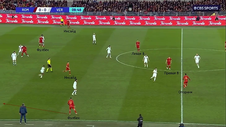 6. Судя по первому матчу, Де Росси не закладывает предустановок по движению. В СПАЛ это называлось «эклектичной атакой». Во владении у римлян нет схемы, но есть принципы, которым обучается каждый игрок – чтобы в отдельном эпизоде сыграть нужную роль, даже если оказался не в своей зоне. Позиционная текучесть упрощает создание пространства – каждый игрок (даже защитник) обязан считывать ситуативную брешь и врываться, если этого не сделал партнер.