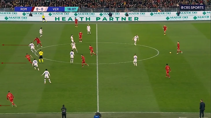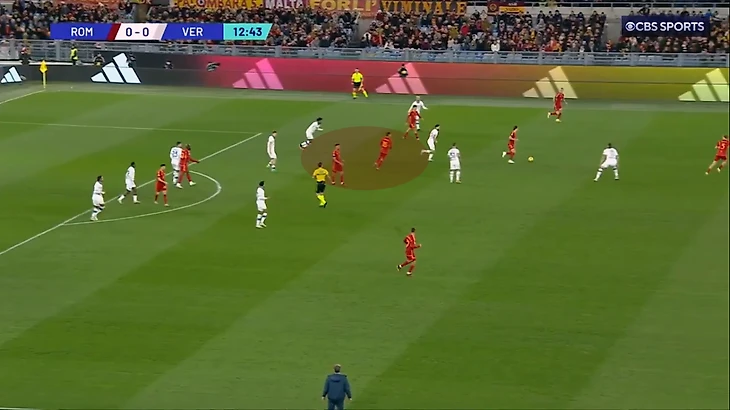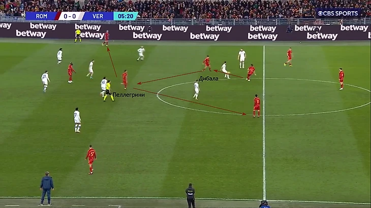 2. Де Росси переключался между зонным и персональным прессингом во второй линии. Иногда переключения были чисто манипулятивными: римляне переходили на зону и перекрывали вертикали, чтобы спровоцировать заброс на Джурича (стандартное упрощение игры веронцев) – во время полета его брали в клетку и забирали подбор.