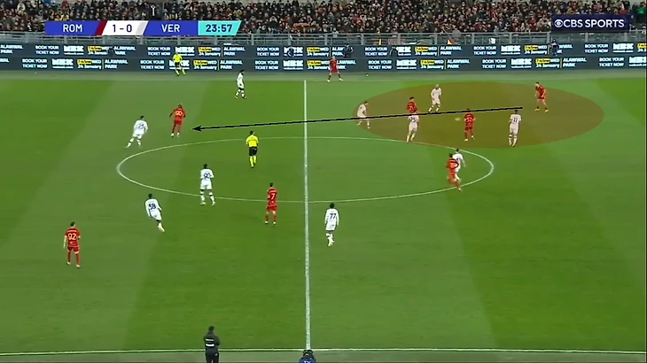 За несколько мгновений до этого момента римляне сместили баланс налево. Теперь у правого защитника есть возможность взорваться за спины под проникающий пас.