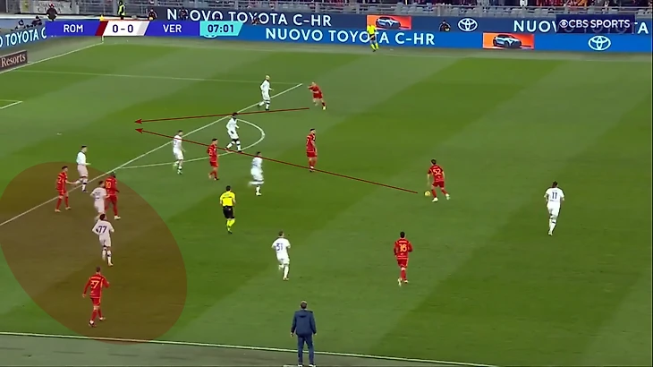 5. «Рома» вернулась к перегрузу зоны и атаке противоположного края. Чтобы усилить эффект, Де Росси отправлял на фланг игроков, которых там не ждали – взаимодвижение ломало оборонительную структуру.