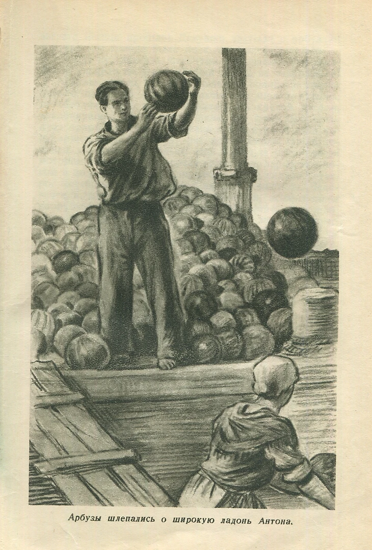 «Антон глядел на левое крыло мавзолея. Там стоял человек к сером френче, в фуражке, надетой прямо и слегка вперед. Антон не отрываясь смотрел ему в глаза. Маршал, стоявший на трибуне мавзолея, наклонился к человеку в фуражке и что-то сказал ему на ухо. Усы человека дрогнули в хорошей, дружеской улыбке».