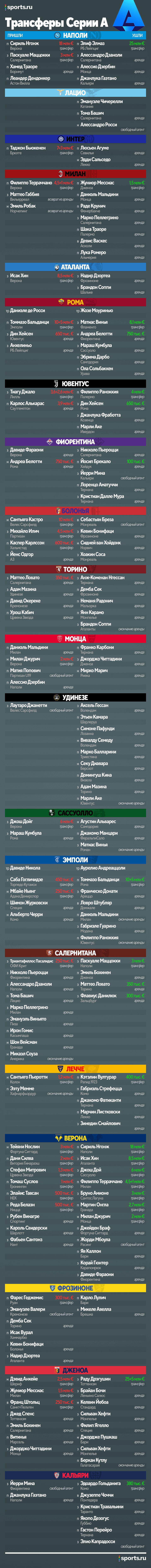 А также «Сассуоло» заплатил 6 млн за защитника «Вероны» Джоша Дойга, «Верона» заработала 40 млн, а у «Дженоа» крупнейшая сделка: продали Раду Дрэгушина в «Тоттенхэм» за 25+5 млн евро.
