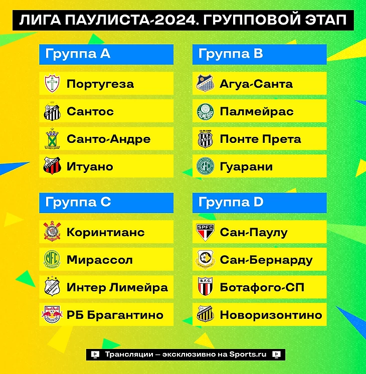 Лига Паулиста – это 16 команд, разделенных на четыре группы по четыре. Об устройстве и принципах турнира поговорим ниже, это отдельное приключение.