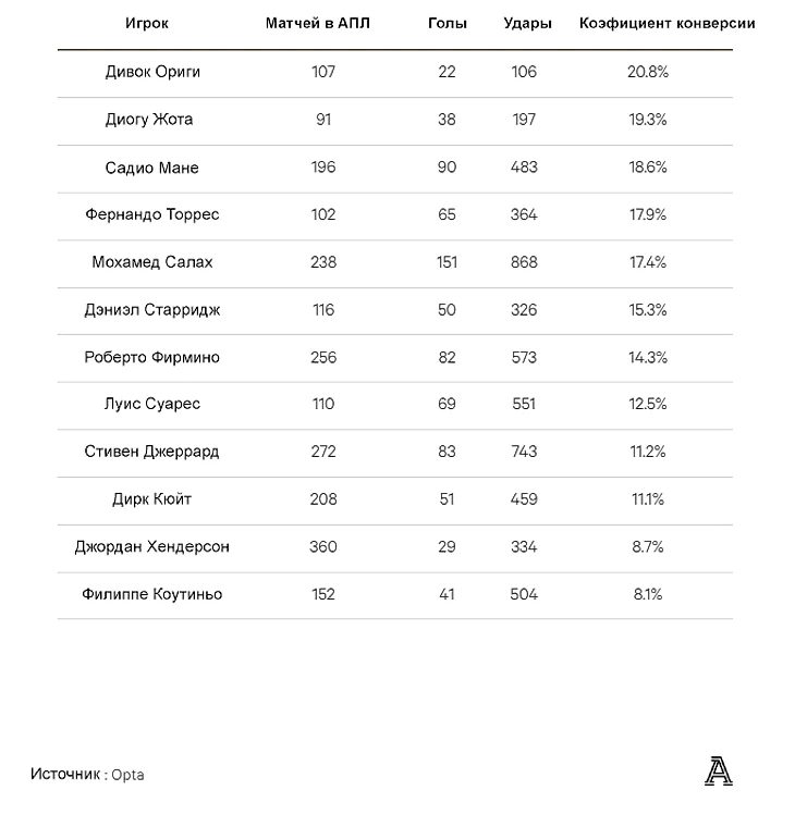 Дивок Ориги имеет лучший коэффициент реализации среди всех игроков «Ливерпуля» с сезона 2006/07