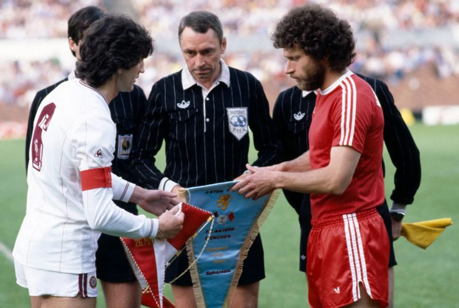 К сожалению, мне не посчастливилось найти подобные фотографии со всех финалов, но хорошо зная форму и стиль и вымпелов, которых придерживались клубы в разные эпохи, могу вас заверить, что наиболее великий по размерам вымпел был изготовлен к финалу Кубка европейских чемпионов 1966/1967, который состоялся 25 мая 1967 года в Лиссабоне на стадионе «Насьонал». В тот знаменательный день капитан «Селтика» Билли Макнилл вручил своему визави из «Интера» Армандо Пикки гигантский вымпел, габаритами совершенно превосходящий все, которые когда-либо делались для финальных матчей.
