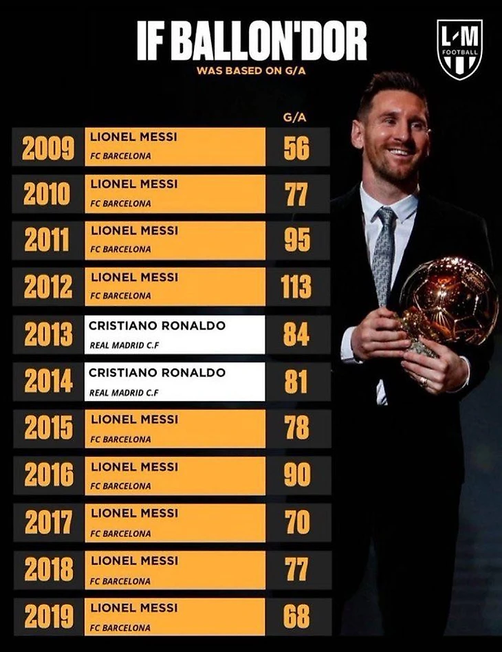 Если бы «Золотые мячи» вручались по системе «гол+пас», то с 2009 год у Роналду было бы только 2 награды, остальные же достались бы Лионелю.