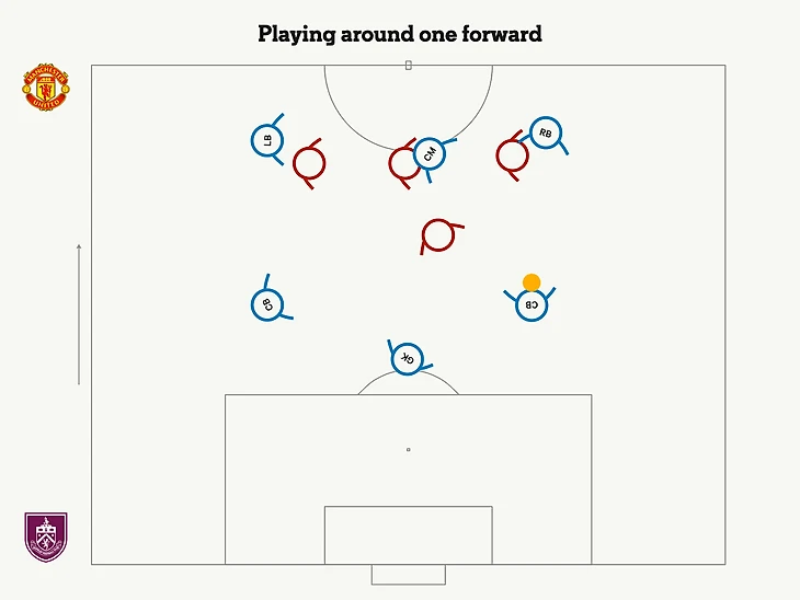 В матче с «Бернли» «Манчестер Юнайтед» пробовал делить поле пополам, втиснув Расмуса Хойлунда между центральными защитниками и направляя билд-ап в одну из сторон. Винсент Компани мог попросить своих игроков отыгрывать мяч назад в штрафную, чтобы выйти из-под прессинга, но передача назад стал бы для Хойлунда триггером для давления на голкипера, в то время как его товарищи по команде активизировались и поджали Бернли глубоко на своей половине поля.