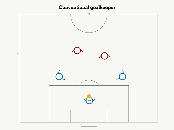 Цель использования вратаря вне штрафной, обычно, заключается в розыгрыше мяча вокруг первой линии прессинга. Когда эта линия состоит всего из одного игрока, это не требует много усилий.