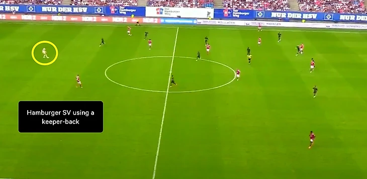 Вместо того, чтобы оставаться в своей штрафной, вратарь «Гамбурга» Джулиан Поллерсбек получил указание располагаться за пределами штрафной площади и играть между центральными защитниками, тем самым, добавляя ширину в последнюю линию и создавая для команды дополнительного игрока на мяче.