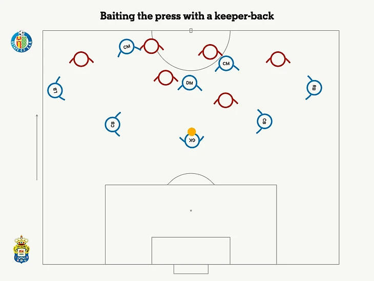 Чтобы спровоцировать прессинг в духе «Брайтона» Роберто Де Зерби, тактически продвинутый Испанский «Лас-Пальмас», любит использовать при билд-ап вратаря Альваро Вальеса в роли центрального защитника в тройке, который перекатывает мяч под подошвой или разыгрывает короткие стенки, чтобы выманить соперника и открыть зоны для продвижения мяча для своей команды.