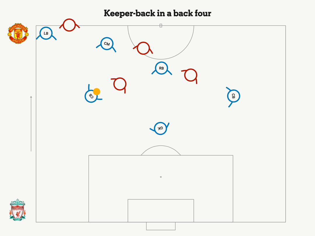 Переход от центрального защитника, в модуле из трех, к защитнику на одной из сторон в четверке увеличивает риски, но также позволяет дополнительному игроку располагаться выше мяча, что дает вратарю множество опций для розыгрыша мяча.