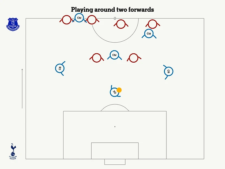 Каждый раз, когда Доминик Калверт-Льюин пытался прессинговать Викарио с одной стороны, другой нападающий «Эвертона» был вынужден оставаться в центре, чтобы не допустить прямого паса опорному полузащитнику. Это позволило левому центральному защитнику «Шпор» Бену Дэвису проходить мимо первой линии прессинга.