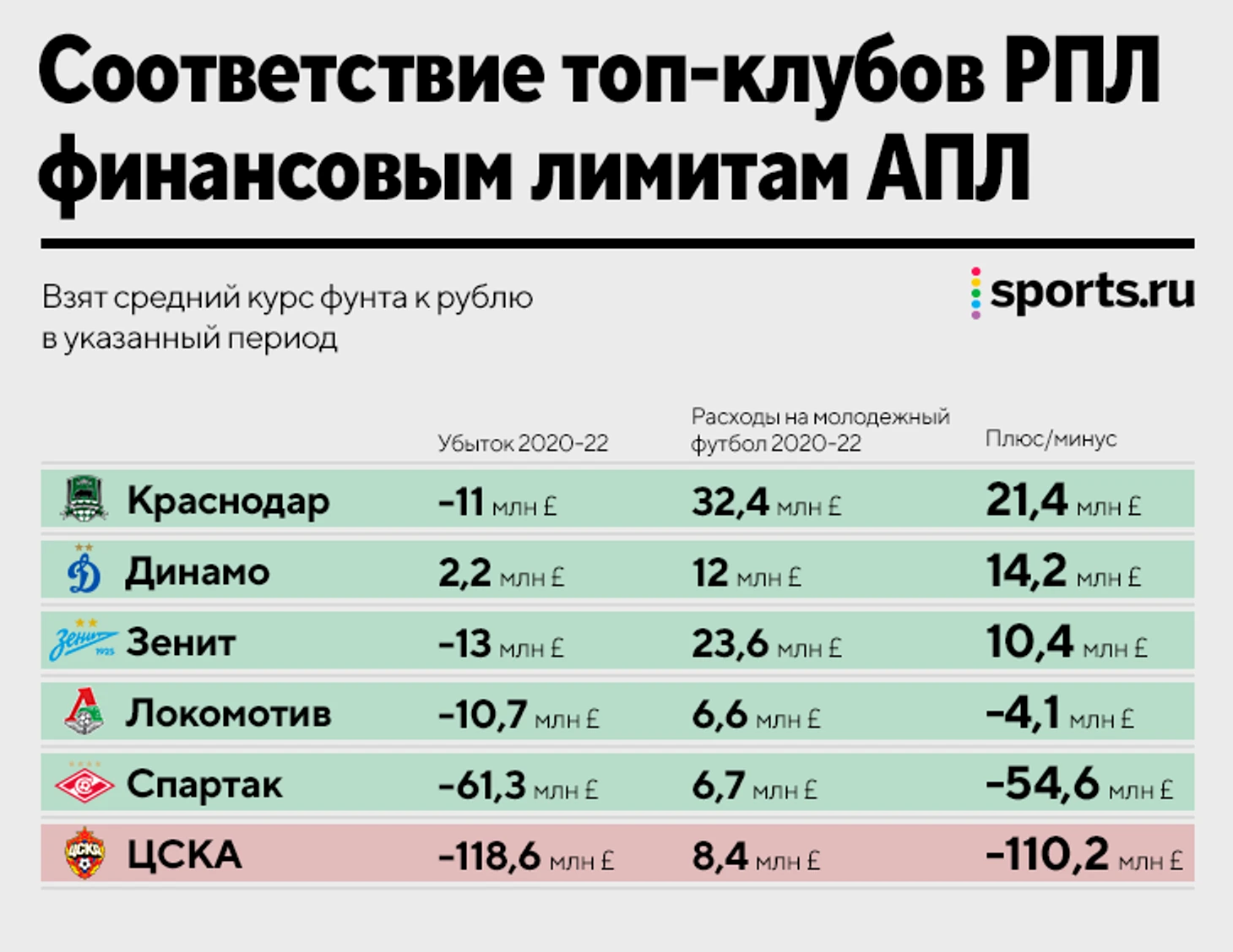 Вывод: за исключением ЦСКА российские топ-клубы укладываются в установленные британские лимиты («Краснодар», «Динамо», «Зенит» – вообще в плюсе). Правда, владельцам «Спартака» пришлось бы покрыть убытки свыше 15 млн фунтов (1,4 млрд рублей) из своего кармана – это 39,6 млн фунтов (3,6 млрд рублей).