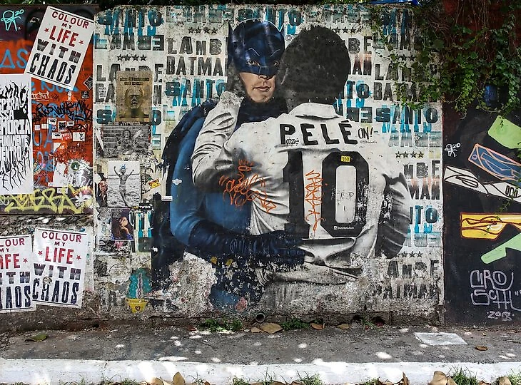 Кстати, уже более десяти лет в разных местах Сан-Паулу появляются сюжеты, где Пеле обнимает и целует Мону Лизу, Сальвадора Дали, Мэрилин Монро, Джона Леннона, Боба Марли, Бэтмена (на фото выше), Эми Уайнхаус и других героев. Это работы бразильского графического дизайнера Луиса Буэно. Он считает, что когда таланты объединяются, их эффективность максимизируется – и в этом суть футбола.