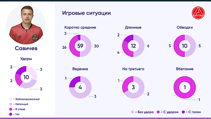 - Савичев активно участвует в продвижении мяча через АВП, особенно за счет коротко-средних и длинных передач, по сумме которых он заметно превосходит всех своих партнеров по команде.