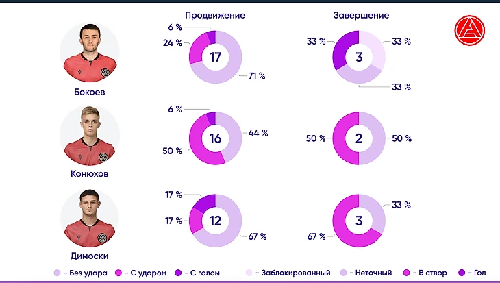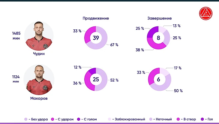 В итоге доля действий, завершавшихся голом у Макарова (23%) выше, чем у Чудина (16%) из-за общего меньшего количества таких игровых элементов в первом круге.