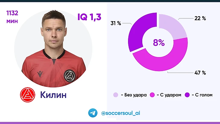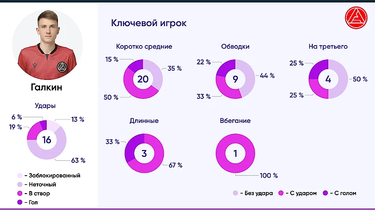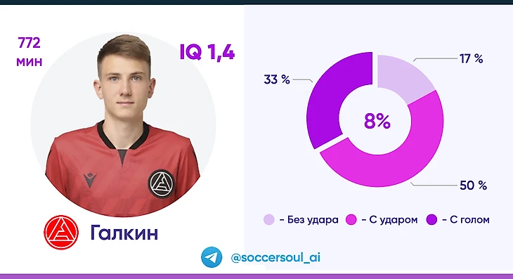 Галкин — ключевой игрок команды, несмотря на ограниченное присутствие на поле в анализируемых матчах. Формирует заметную долю командного IQ и существенно влияет на результат, имея высокую эффективность атакующих действий.