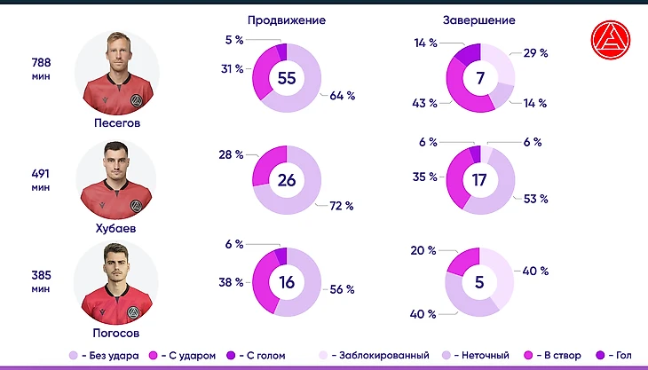 «+» У Песегова самая высокая доля действий через АВП, приводивших к голу (16%);