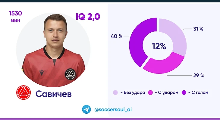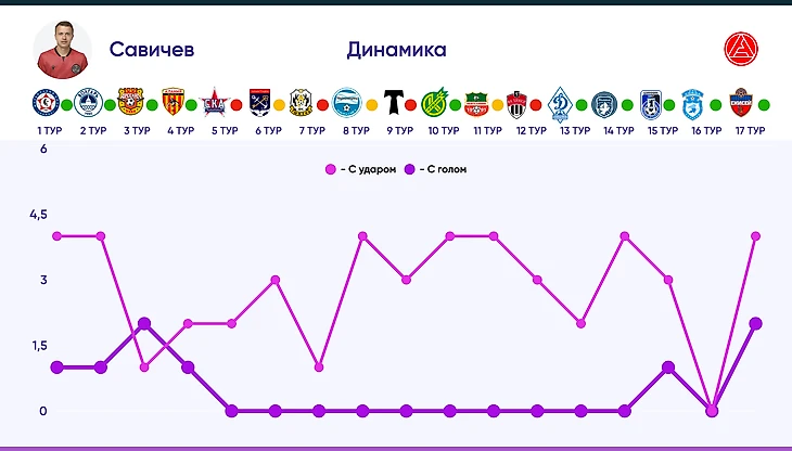 Савичев — ключевой игрок стартового состава, с самым высоким уровнем влияния на IQ команды. Его действия на поле оказывают ощутимый эффект на итоговый результат. Стабильно принимает участия в матчах, при этом имея наиболее высокий средний показатель IQ, что делает его центральной фигурой Акрона в первом круге.