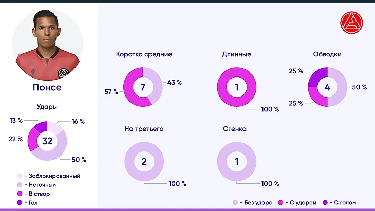 - Сумма элементов фазы продвижения мяча через АВП у Понсе одна из самых низких в команде, что указывает на его ограниченное участие в создании атак.