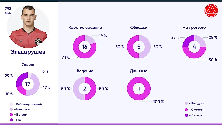 - Эльдарушев высоко ориентирован на удар по воротам соперника, как в качестве участника предударной комбинации, так и в качестве бьющего. Такие элементы составляют 83% от всех его действий.