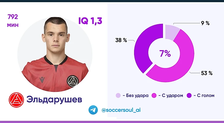 Эльдарушев — важный игрок, главная ударная сила команды. Наиболее продуктивный футболист атакующей линии, с наибольшим в команде влиянием на результат и максимальной эффективностью атакующих действий.