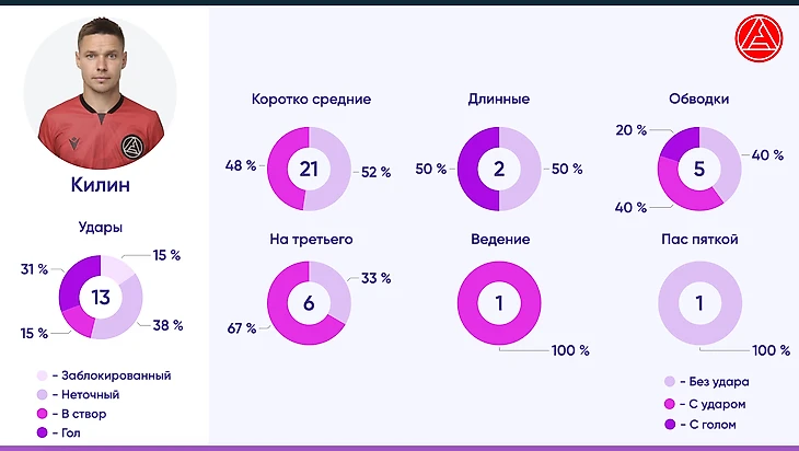 - Он является одним из лидеров команды по количеству действий, приводящих к ударам по воротам, как в количественном, так и в процентном значении (37%).