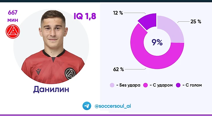 - По среднему показателю на один сыгранный матч, уступает только лидеру – Савичеву. По IQ на 90 минут игры Данилин также второй в команде, после еще одного игрока ротации – Апекова;