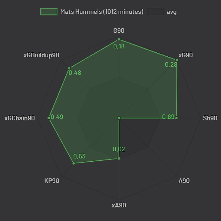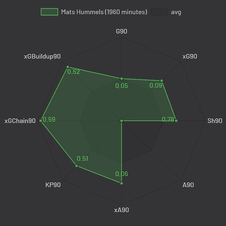 В Бундеслиге же не всё так однозначно. Прежде всего вынесем за скобки матч с Лейпцигом, где Матс решил не позориться и удалился на 15 минуте. Общая картина такая: в прошлом сезоне статистически Хуммельс был сильнее при построении атак и общей вовлечённости в игру. Но сильно ли?