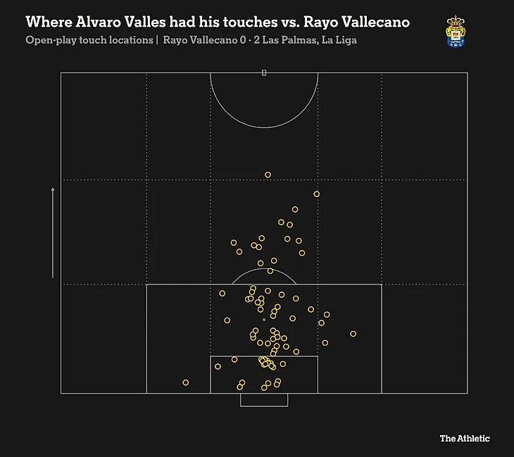Но функции Вальеса в команде не ограничиваются мощной игрок на ленточке: Пимьента активно использует голкипера при построении атак. Оцените карту касаний вратаря «Лас Пальмаса» в матче против «Райо Вальекано»: