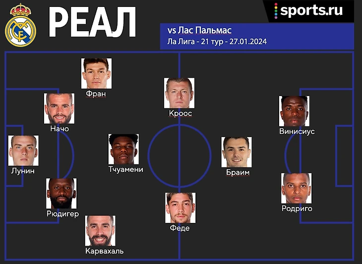 Выход Лунина в основе анонсировал сам Анчелотти, по остальным позициям тоже все в целом понятно. Браим заменит в старте Беллингема, сыграв на самой привычной для себя позиции.
