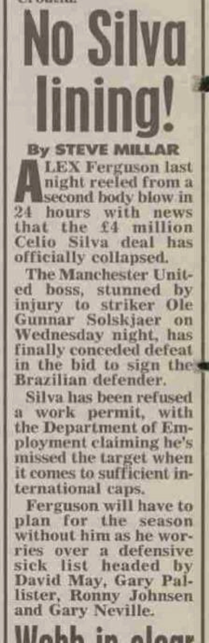 «По словам директора английской команды Мориса Уоткинса, соглашение между двумя клубами очень близко к заключению. Подписание защитника, за которое «Манчестер Юнайтед» заплатит 5,9 миллиона долларов, является личной просьбой тренера клуба Алекса Фергюсона. Однако «Коринтианс» отрицает контакты с английской командой. «По игроку не поступило никакого официального предложения» - говорит футбольный суперинтендант «Коринтианс» Жозе Тейшейра. В Англии подписание защитника воспринимается как нечто само собой разумеющееся. Игрок уже принял предложение английской команды и ждет только разрешения на работу в этой стране - документа, на выдачу которого уходит около трех недель. Если предложение и продажа игрока за $5,9 млн будут подтверждены, Селио Силва получит 885 тысяч долларов, поскольку, отыграв за «Коринтианс» три года, он имеет право на 15% от стоимости продажи.»