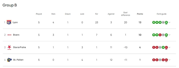 • В этой группе всё ясно: «Лион» первый, «Бранн» – второй, «Славия» – третья, а «Санкт-Пёльтен» замыкает квартет.