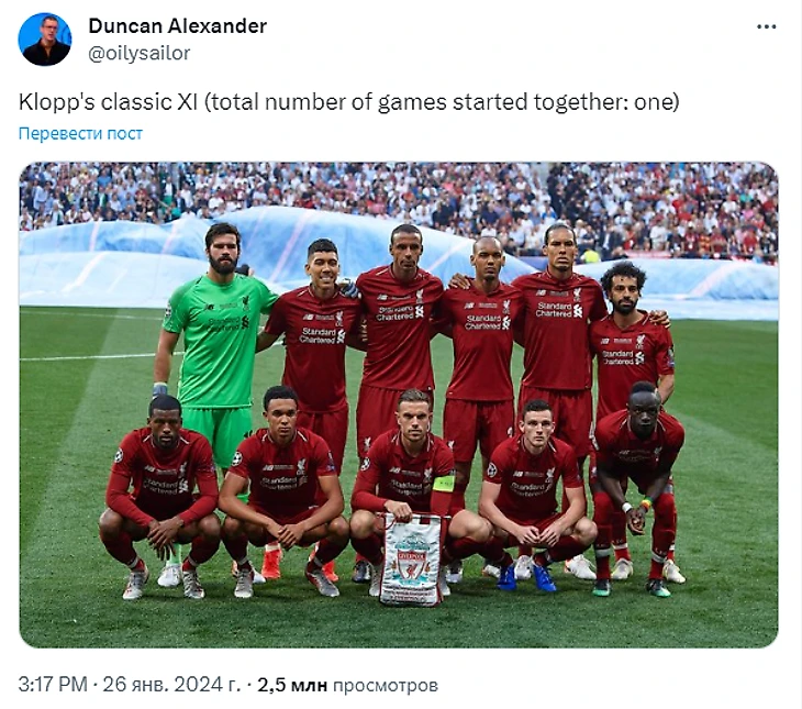 Однако, как утверждает журналист The Athletic Данкан Александер, финал ЛЧ − это первый и последний раз, когда «Ливерпуль» вышел на поле с этими одиннадцатью игроками. В это трудно поверить, но это действительно так.