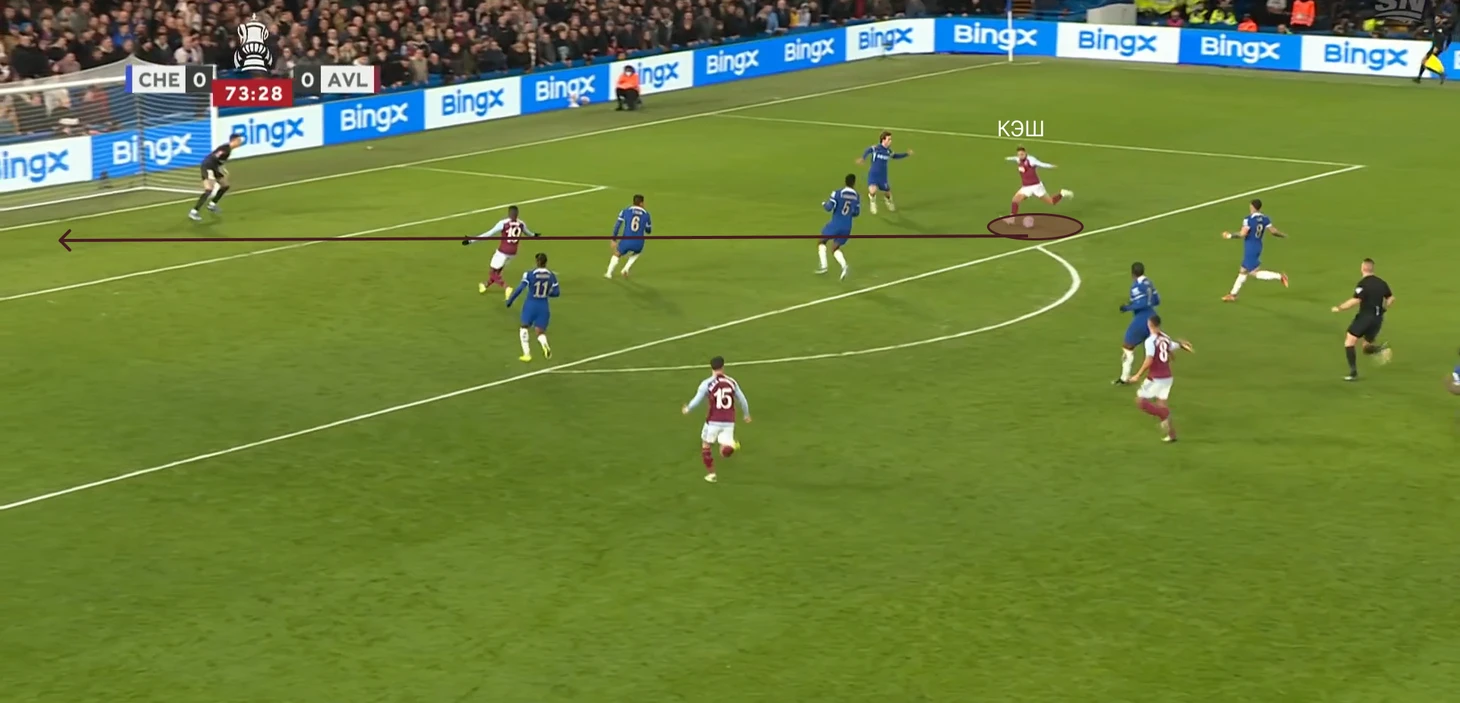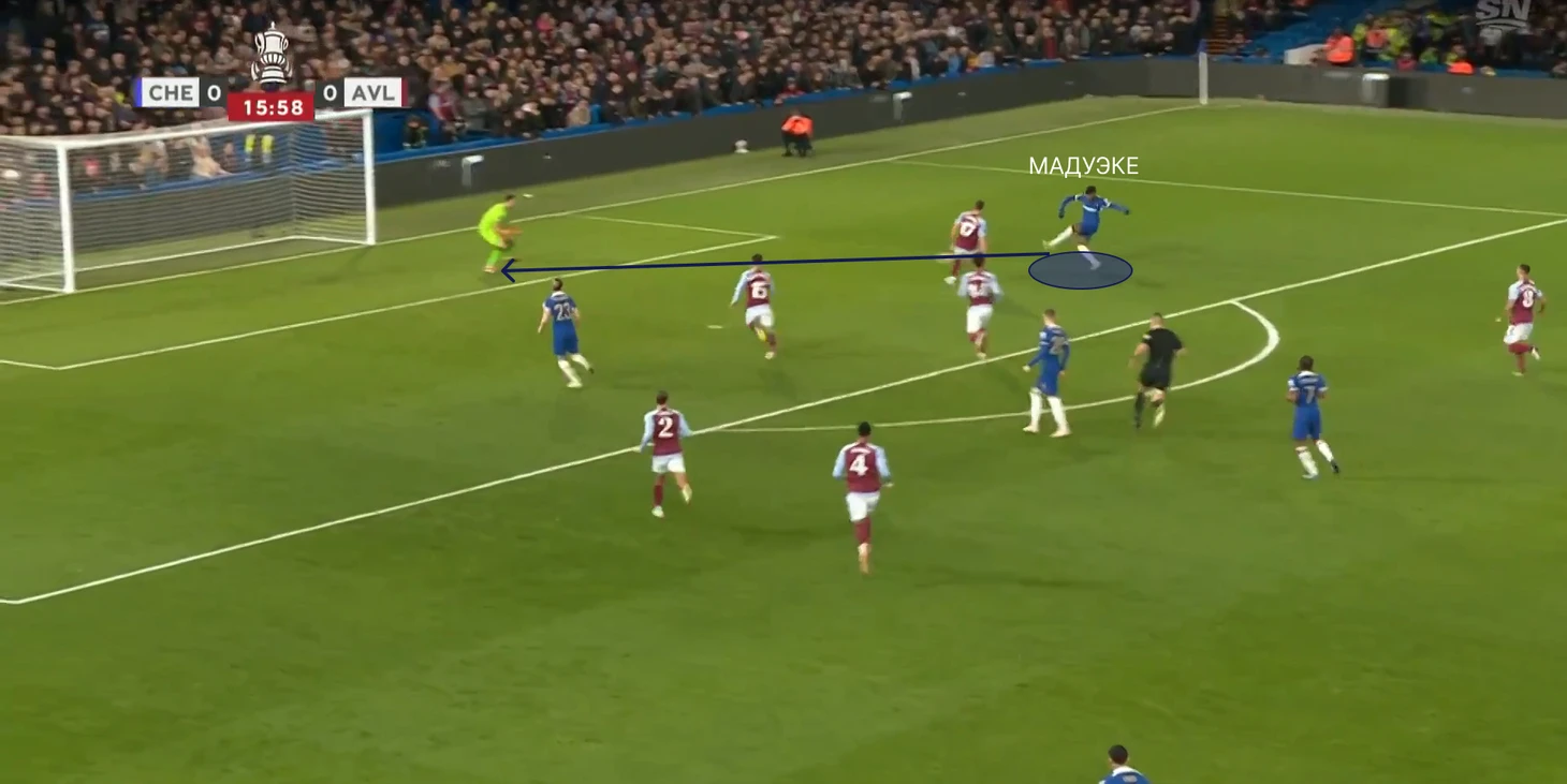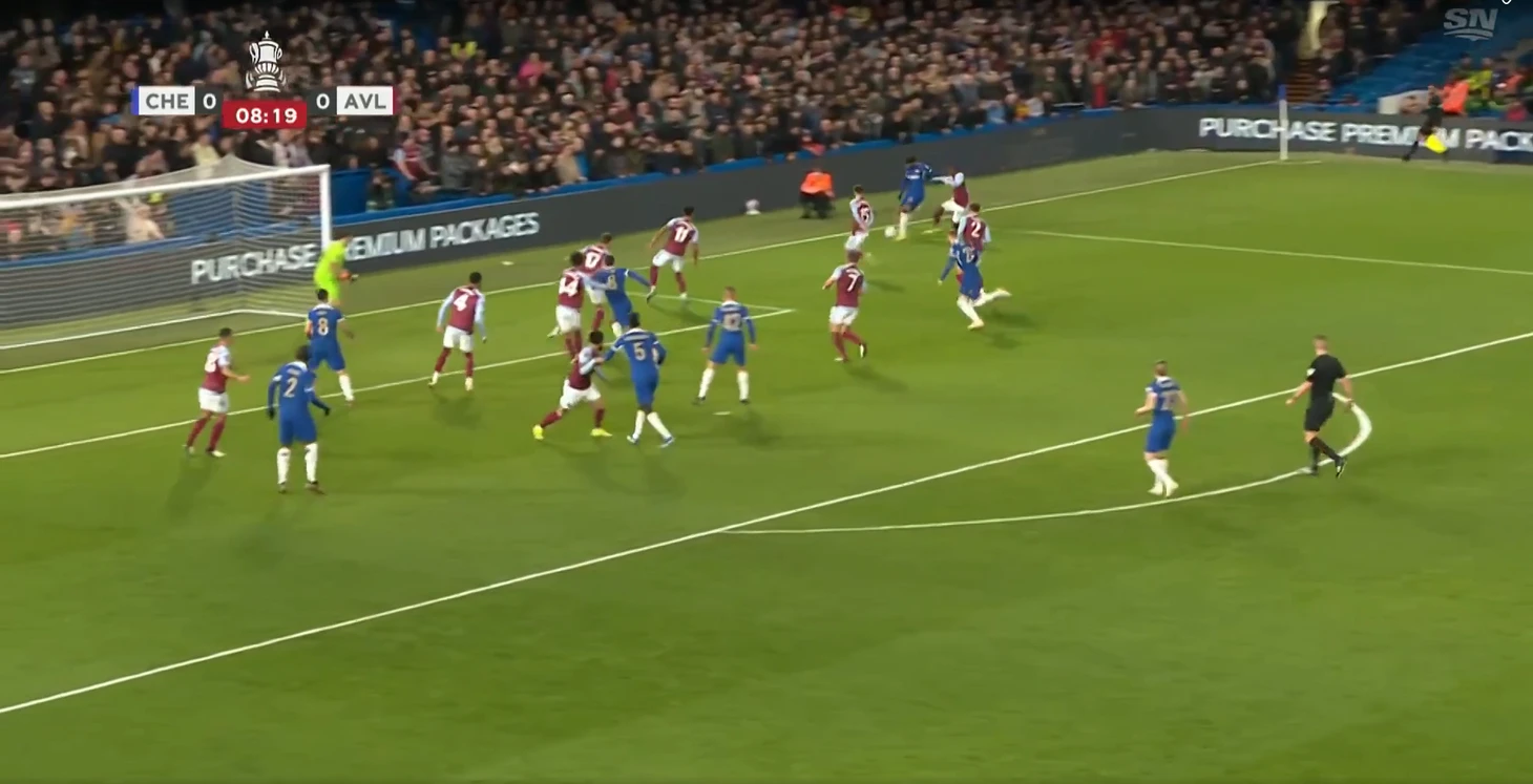 Когда Челси все-таки создавал опасные подходы, то принимались довольно-таки странные решения – прострелы в штрафную, где находится весь состав Астон Виллы и пол состава Челси. Пример момента смотри ниже.