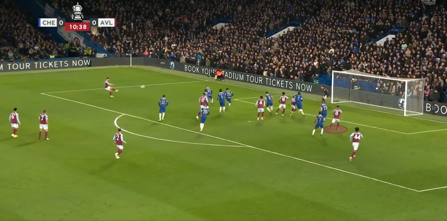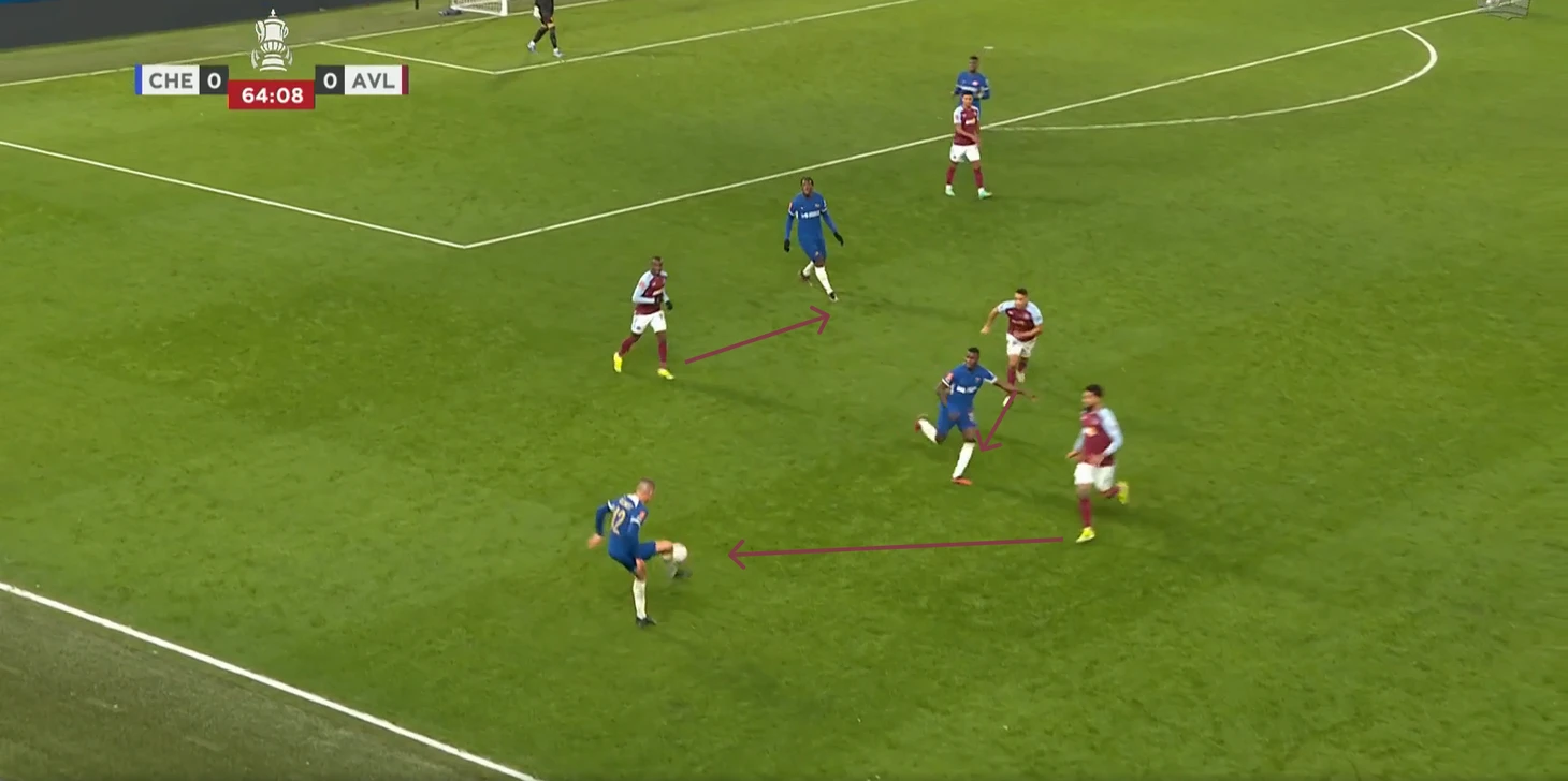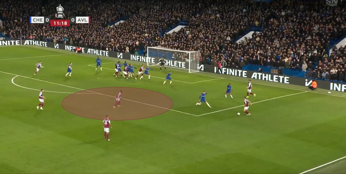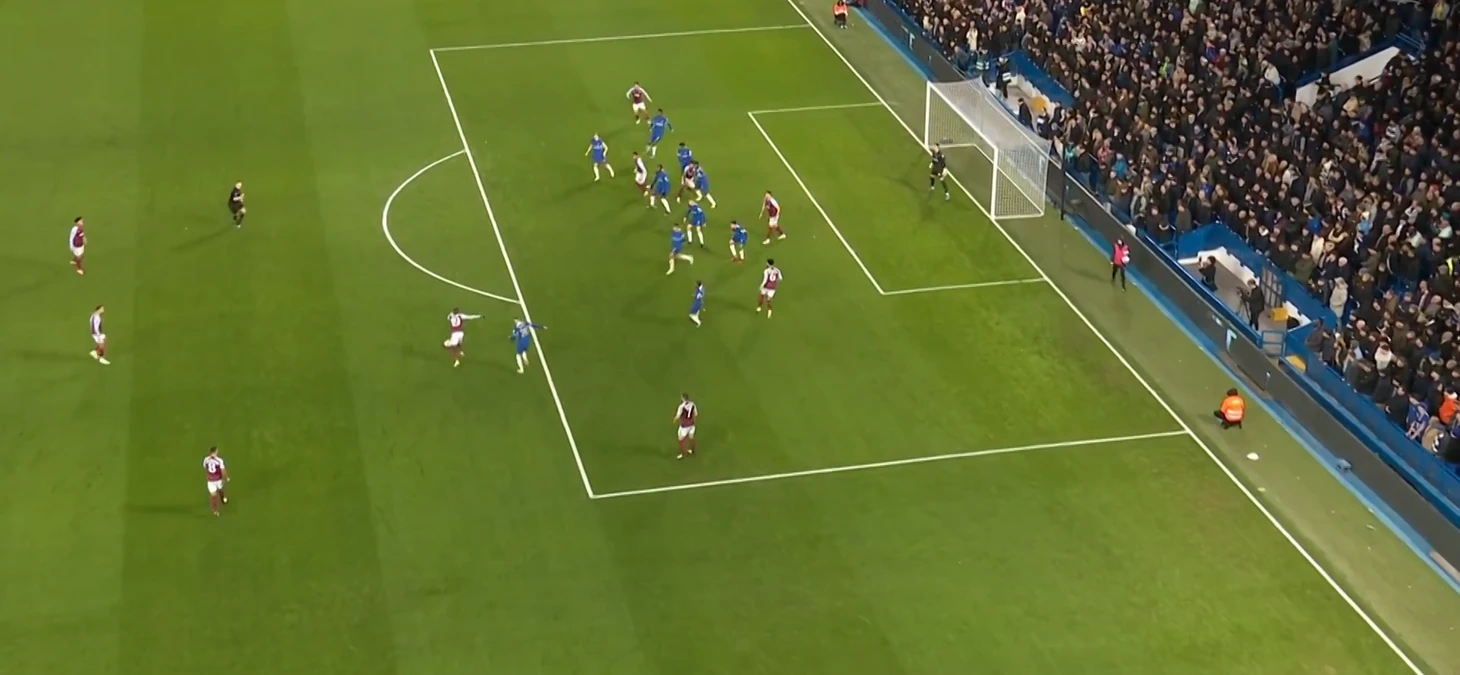 Когда Челси все-таки создавал опасные подходы, то принимались довольно-таки странные решения – прострелы в штрафную, где находится весь состав Астон Виллы и пол состава Челси. Пример момента смотри ниже.